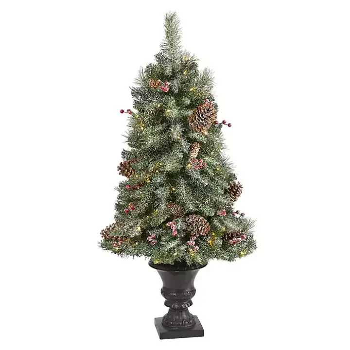 This 4 ft. Pre-Lit Frosted Berry and Pine Tree in Urn would look perfect next to your front door or fireplace! Its frosted finish adds a touch of winter charm.