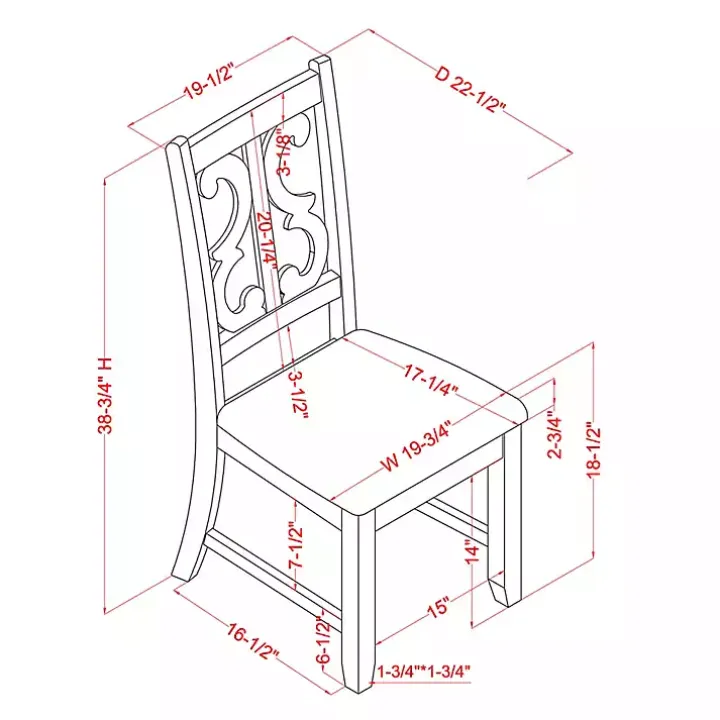 - Each chair measures 20L x 22.5W x 38.75H in.; seat measures 18.5H in.