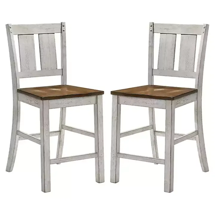 The Antique White & Dark Brown 2-pc. Counter Stool Set will look perfect in your country-inspired dining room. The two tone finish, plank style backs, and nailhead trivets blend into the bold, rustic look.