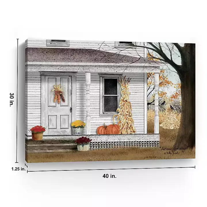 Complete with mums and pumpkins on display, this Autumn Greetings Canvas Art Print captures a picturesque fall porch. It will add the perfect fall charm to your space!