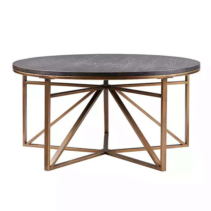 With its distressed black wood veneered top and understated antique bronze frame, this chic Black Antique Bronze Kayden Round Coffee Table will be an eye-catching statement piece in any room.