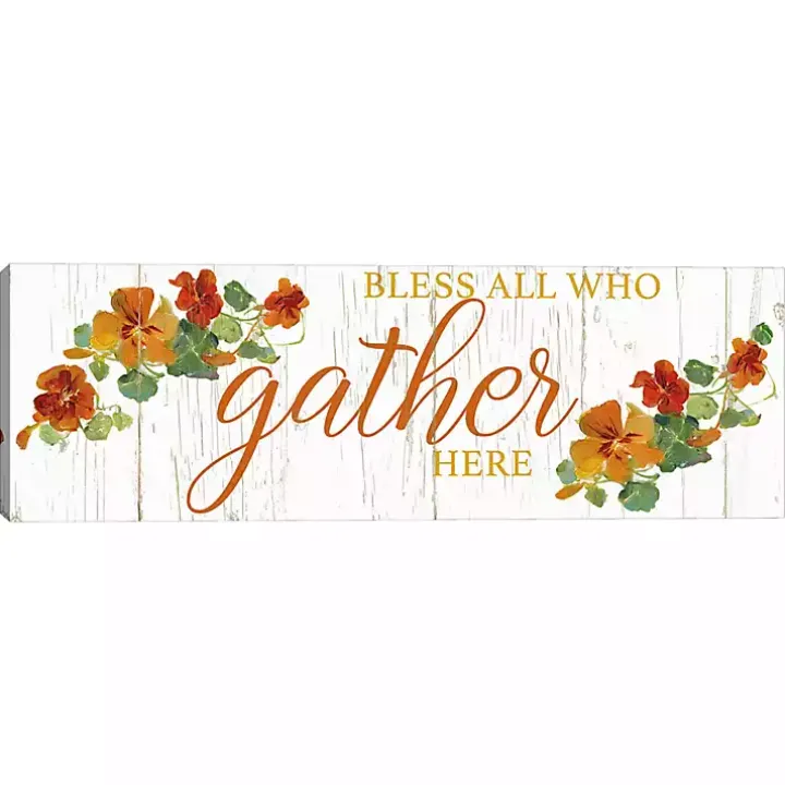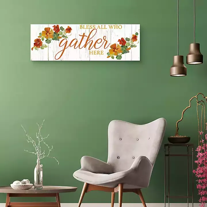 This Bless All Who Gather Here Fall Canvas Art Print is a heartwarming, flush-framed canvas that beautifully captures the essence of togetherness. This illustration is set against a wood-like background for a rustic look.