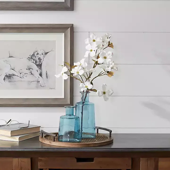 The set of Blue Glass Bottle Vases will look lovely in your coastal interior. While it beautifully displays faux flowers, it adds a subtle pop of color to any space!