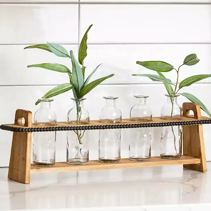 The Bottle Vase Runner with Wooden Stand will make a stylish centerpiece for your mantel or console table. Fill it with delicate flower stems to complete the look!