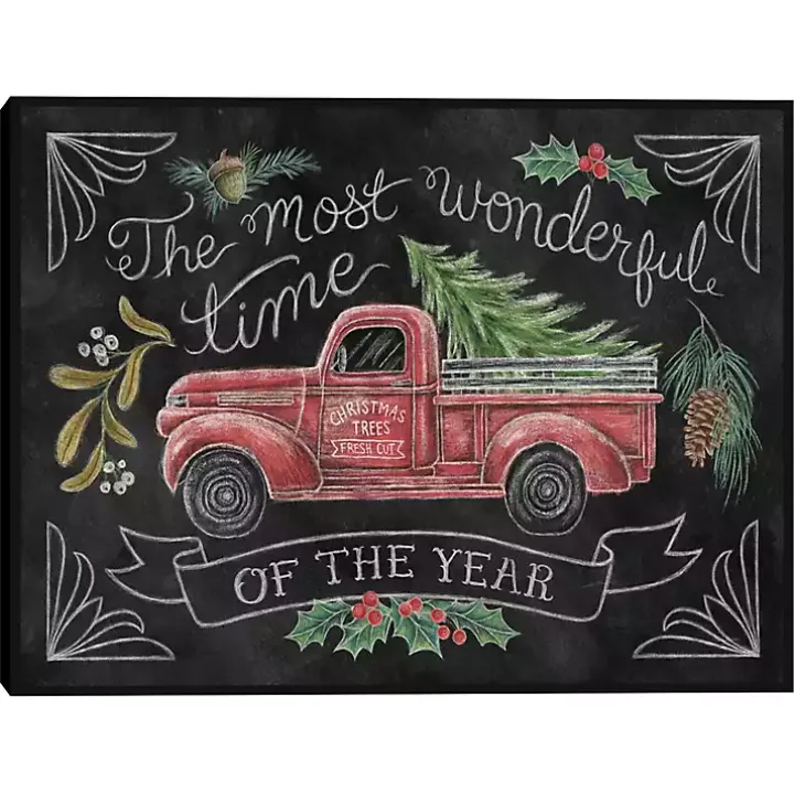 - Features a chalk board-like vintage truck carrying a Christmas tree