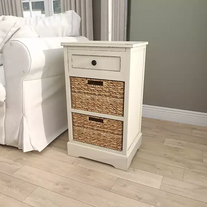 Our Cream Wood Side Table with Woven Baskets is designed with the essence of timeless sophistication, where rich old-world textures and warm hues come together for a refined classic taste of understated luxury. You’ll love the woven baskets for extra storage!