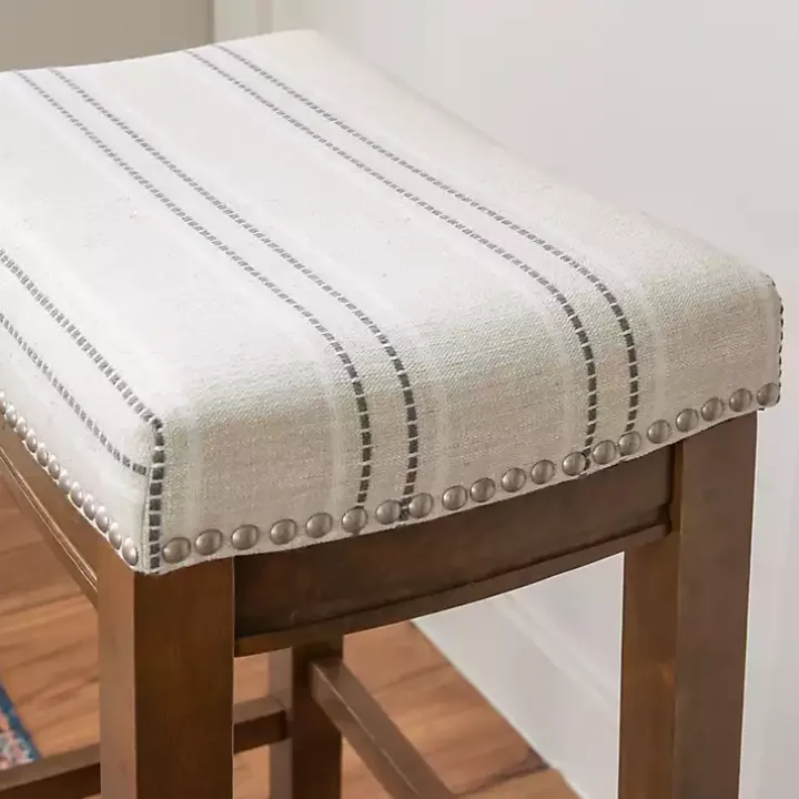 Hang out in style with our Dark Wood Bar Stool with Gray Striped Cushion! The brushed silver nailhead trim is an eye-catching detail you’ll love.