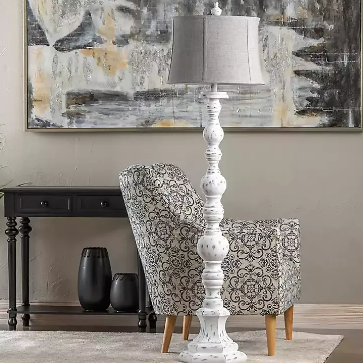 Add a vintage element to your home with this Distressed White Floor Lamp. Its classic style and light, neutral colors will fit in nicely with any type of decor!