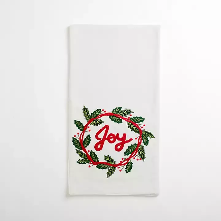 - Features embroidered wreath with the word “joy” in the center