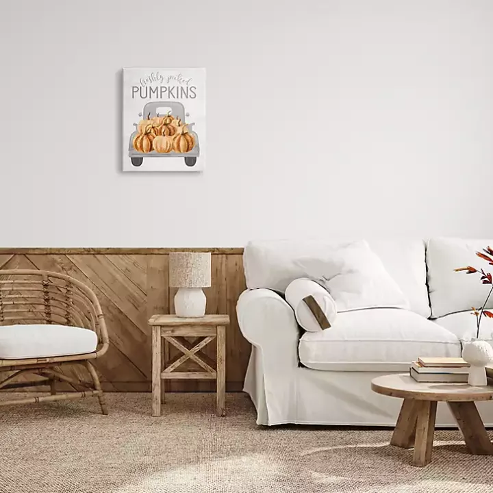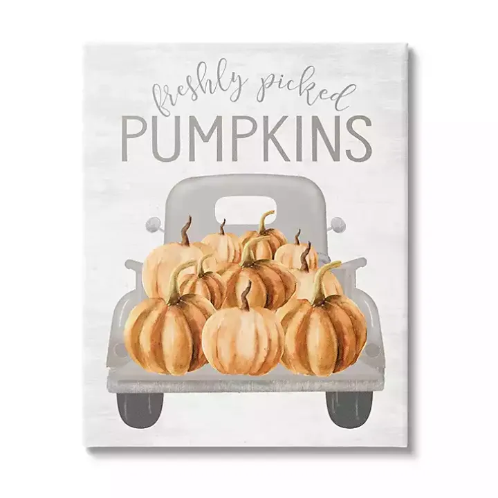This festive farm truck is filled to the brim! Enhance the cozy, country charm of your space with this Freshly Picked Pumpkins Canvas Wall Plaque.