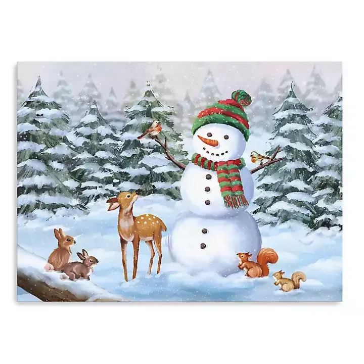 Bring the winter wonderland indoors with this Friendly Snowman Canvas Art Print. The cute snowman and his animal crew will bring a burst of holiday joy to your space!