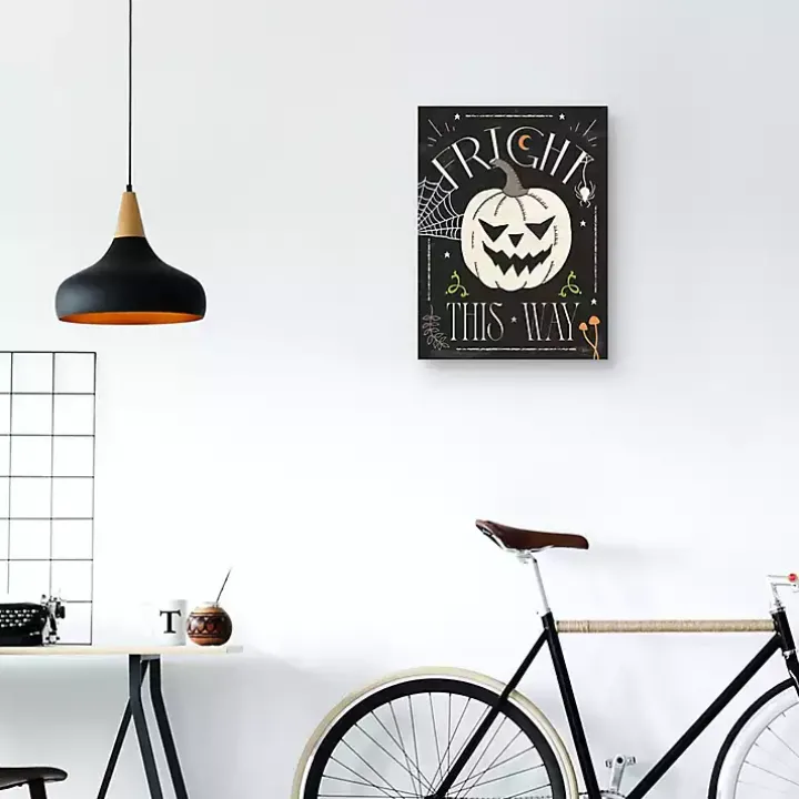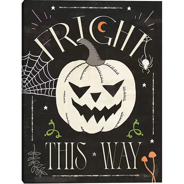 Invite the spirits of Halloween into your home with this Fright This Way Canvas Art Print. The friendly Jack o lantern is sure to haunt your home this spooky season!