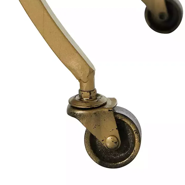 Display your bar accessories with style and ease with this Gold Metal Circular Bar Cart. With its wheels and mirrored shelves, it’s perfect for serving guests.
