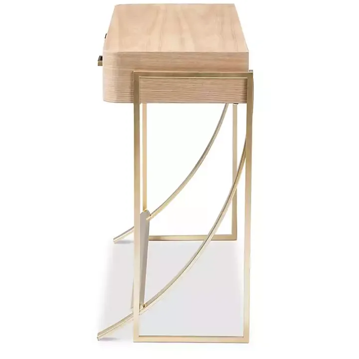 - Gold frame finish with a light brown stained wood finish