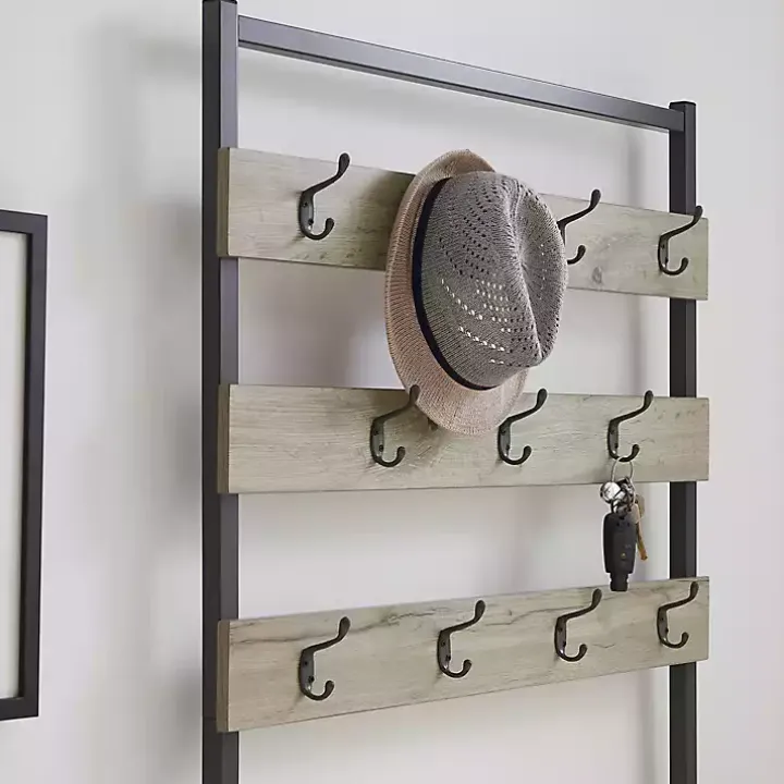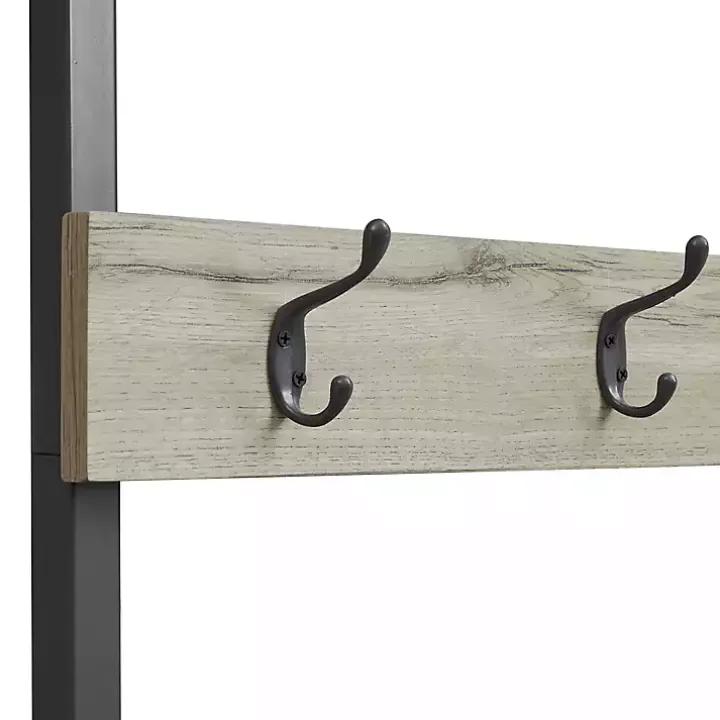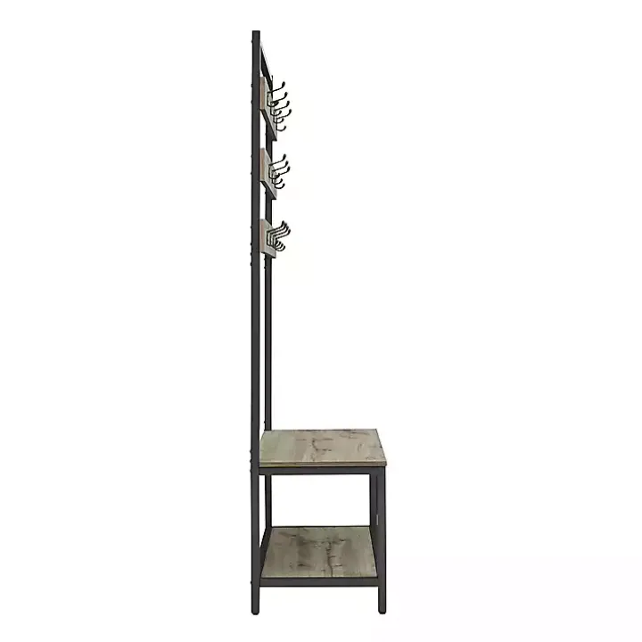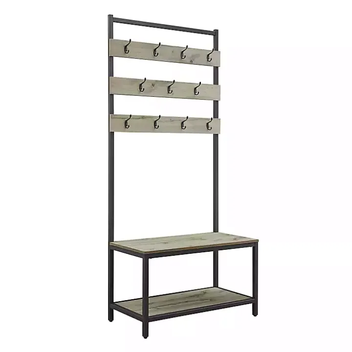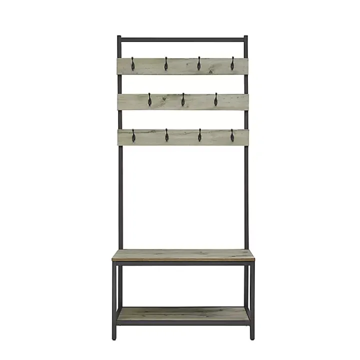 Elevate your entryway with this Gray and Black Wood Bench Hall Tree. Featuring an abundance of hooks and a lower shelf, it’s ideal for storing coats, hats, shoes, and more! Plus, its bench provides a convenient seat or place for bags!