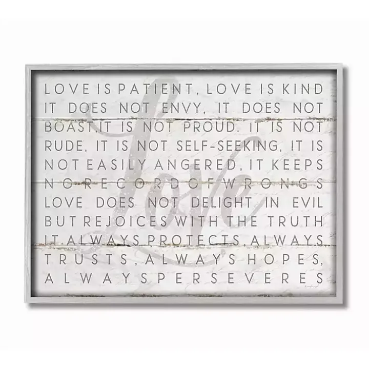 - Features Bible verse 1 Corinthians 13:4-7 in gray lettering