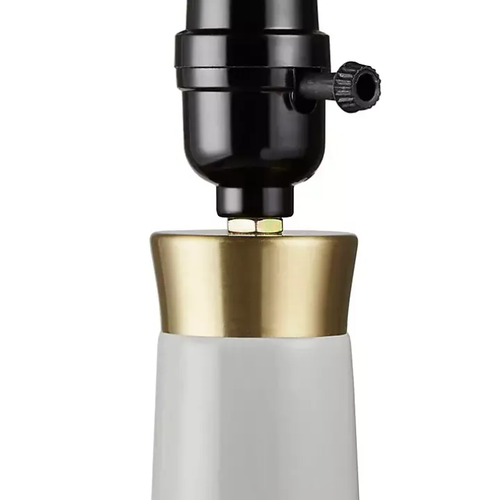 The Gray Ceramic Zazie Table Lamp boasts a genie-style design with a refined ceramic base and gold accents. Its cream drum shade emits a warm, versatile glow, adding sophistication to any space.