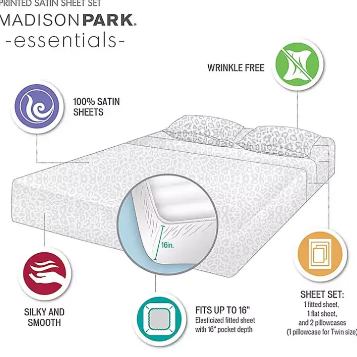 Treat yourself and your bedroom with the elegance of our Gray Leopard Print Satin 3-pc. Twin Sheet Set. These luxury, wrinkle-free satin sheets are silky smooth to the touch and feature a glamorous animal print that elevates the style and comfort of your bed.