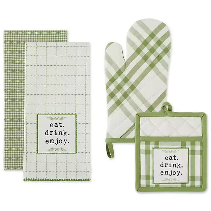- Towel and potholder feature the phrase “eat. drink. enjoy.”