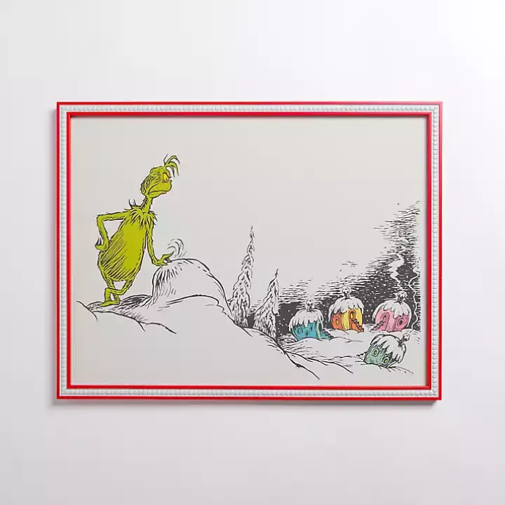 This Grinch Looking Over Whoville Framed Art Print brings a classic Christmas story to life! Its bright, illustrated style captures the playful magic of the holiday season!