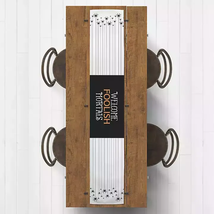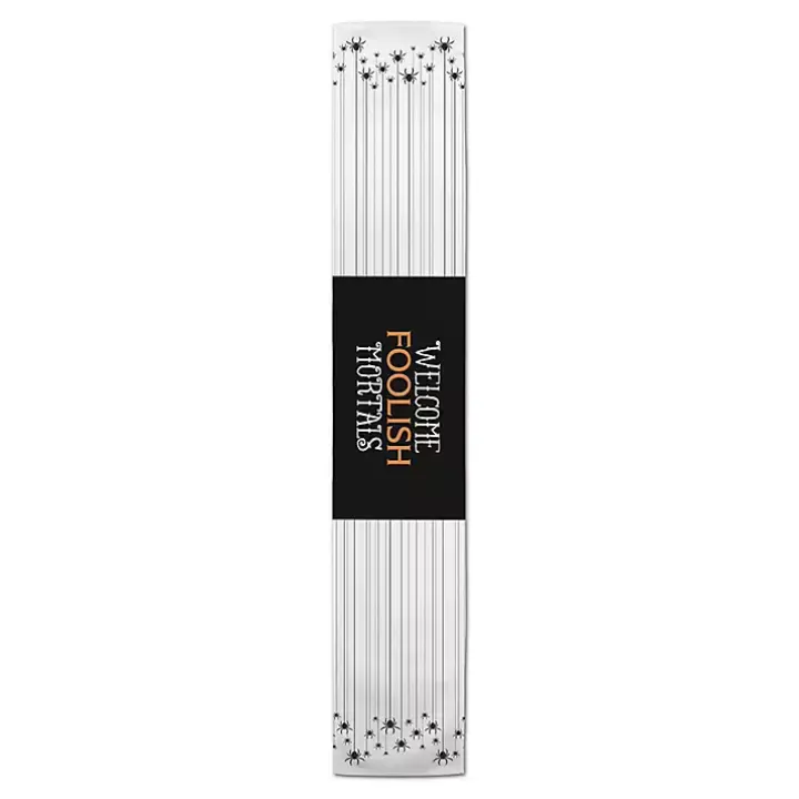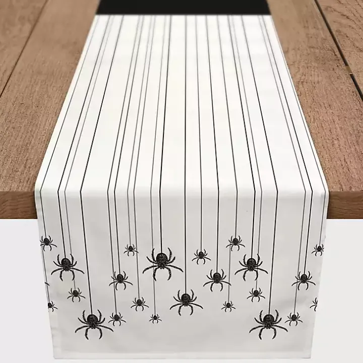 Capture guests in a full belly web with this Hanging Spiders Halloween Table Runner. The hanging spiders will be sure to please in hues of black and white.