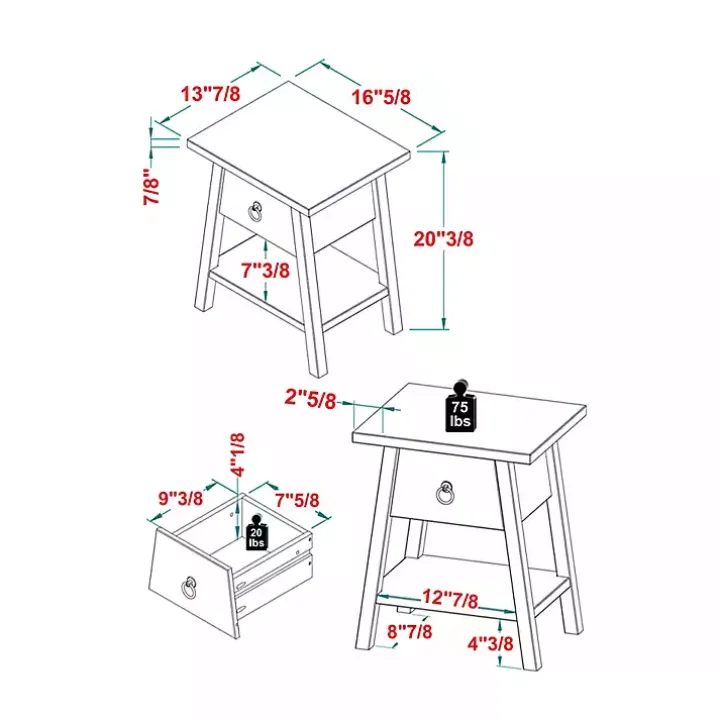 - Table measures 16.6L x 13.9W x 20.4H in.