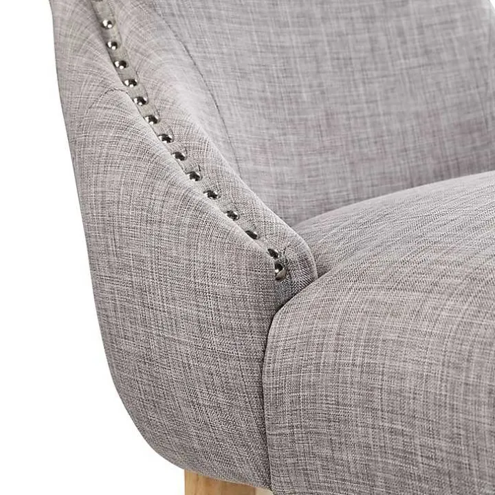 The set of Light Gray Wingback Dining Chairs will bring a sense of glamour and great comfort to your dining room. The curved backs, nailhead detailing, and natural wood leg finish create a beautiful balance of modern and traditional design.