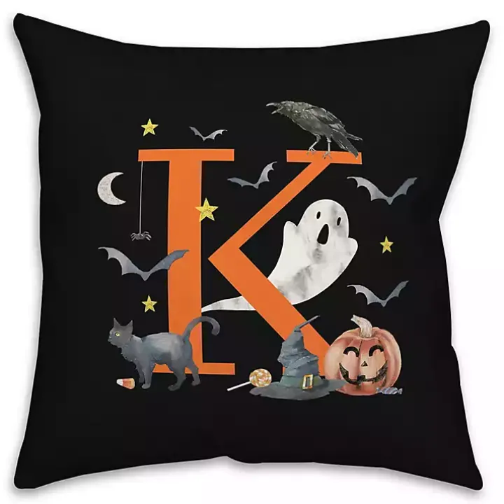 Add a custom touch to your Halloween decor with this Monogram K Halloween Indoor/Outdoor Pillow. Its cute ghost, jack o lantern, and black cat will bring the party to your haunted house!
