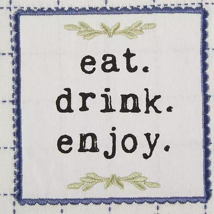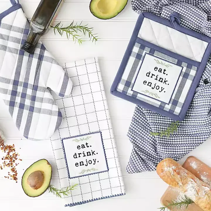 - Towel and potholder feature the phrase “eat. drink. enjoy.”