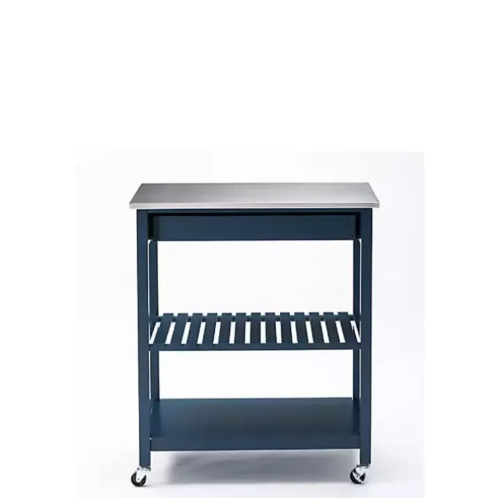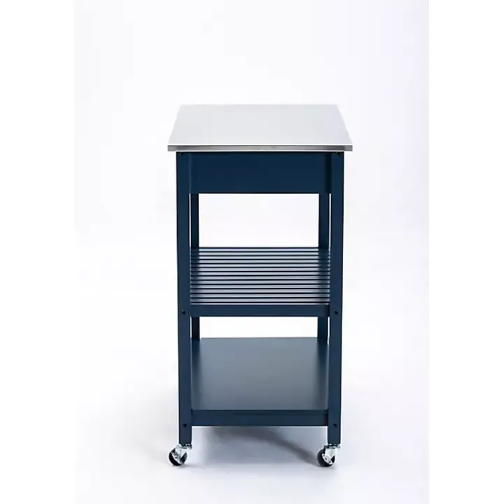 Fulfill all your dining and entertaining needs with this Navy Wood and Stainless Steel Top Kitchen Cart! Whether it’s used as a baking station or bar cart, it’s a must-have for any small space.