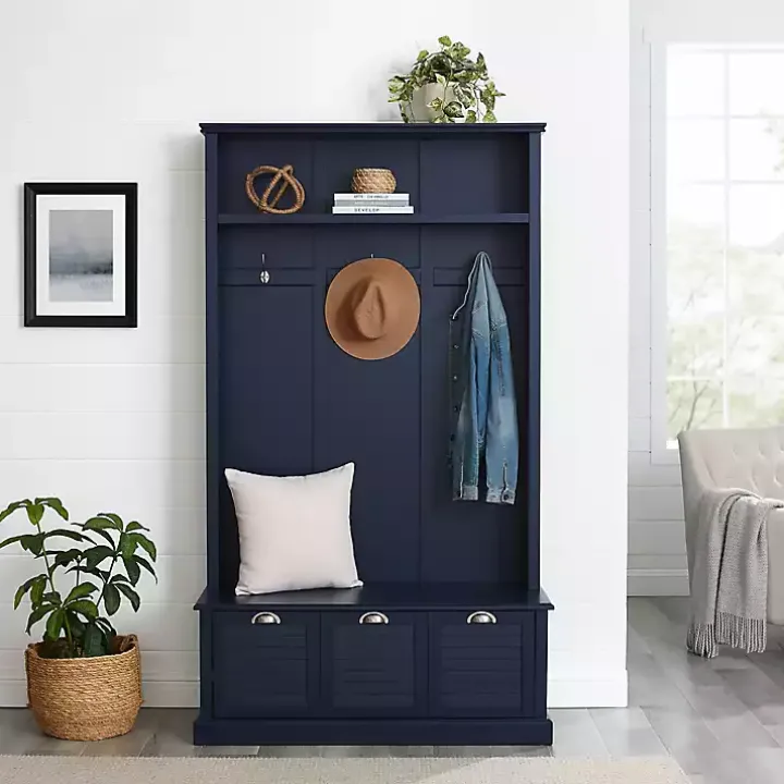 Add storage to your entryway or mudroom with this Navy Wood Storage Bench Hall Tree. Its hooks and drawer make is easy to keep everyone’s coats and shoes organized. Plus, it provides a a convenient seat!