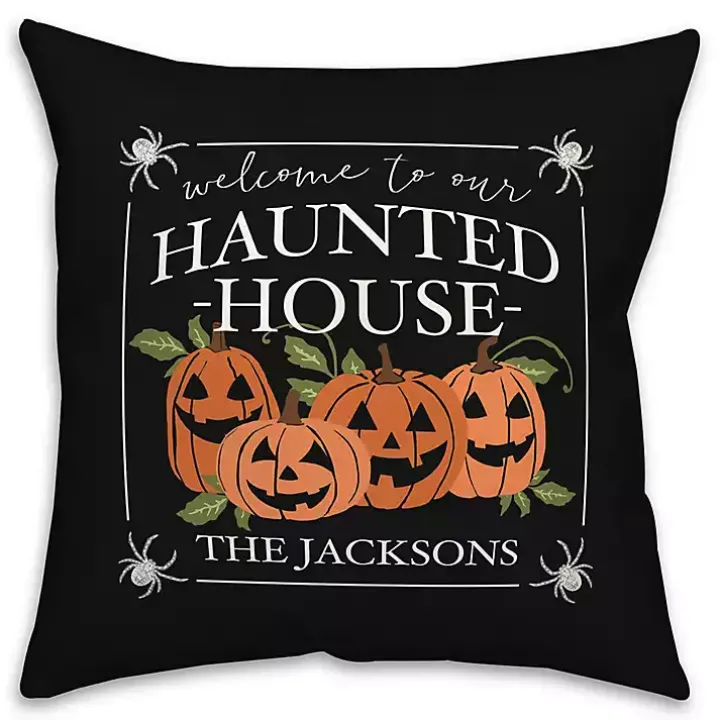 - Reads, “Welcome to our haunted house” with jack o lanterns and spiders