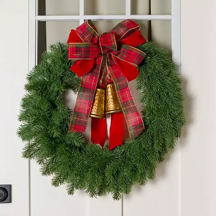 Bring Christmas elegance to your front door with our Plaid Bow and Gold Bells Juniper Wreath. Its simple, lush design is given a holiday makeover with decorative bells and an eye-catching bow!
