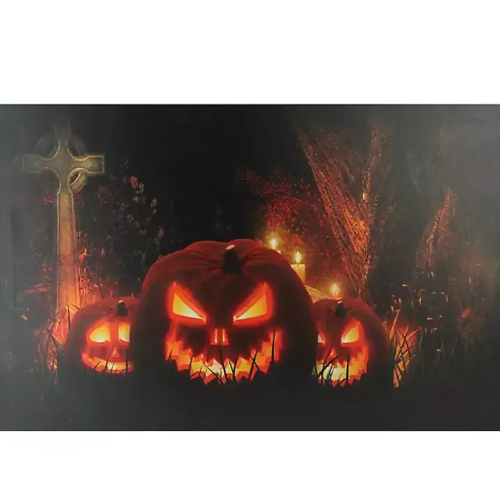 Light up your Halloween party with this Pre-Lit Jack O’ Lantern Cemetery Canvas Art Print. Its soft, eerie glow will make any space a little bit spookier!