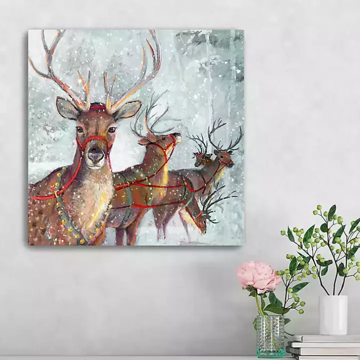 On Comet, Cupid, Donner, and Blitzen! Our Reindeer in the Snow Canvas Art Print features some of Santa’s magical animals in a wintery backdrop that you’ll adore.