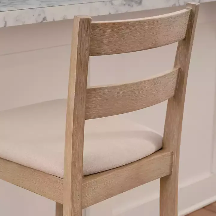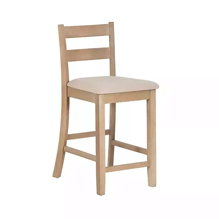 This Rustic Graywash Wood Upholstered Counter Stool features simple yet elegant details, like its ladder back design, rustic finish, and flared legs. Solid wood construction and quality craftsmanship make this a stylish and sturdy seating option for your dining area!