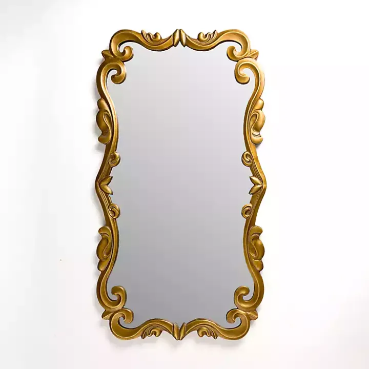 Featuring golden, graceful curves, this Serena Antique Gold Carved Scroll Wall Mirror will bringelegance to your space. It’s sure to be the centerpiece of any wall!