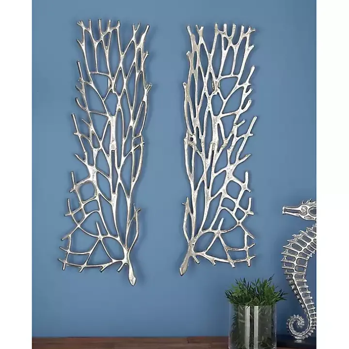 The set of Silver Metal Coral Panel Wall Plaques will add a touch of whimsy and coastal elegance! The polished finish and abstract cutout shapes lend unique texture and dimension to your walls.