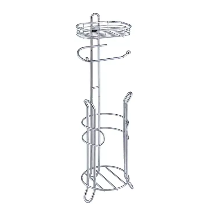 Bring convenience to your bathroom with this Silver Toilet Paper Storage Stand with Basket. Its simple, modern design and shiny finish will blend seamlessly with your decor!