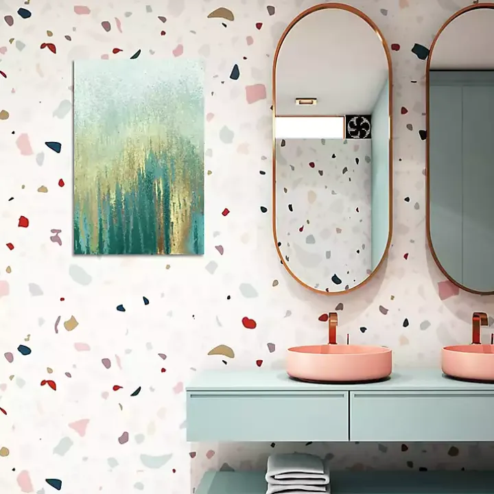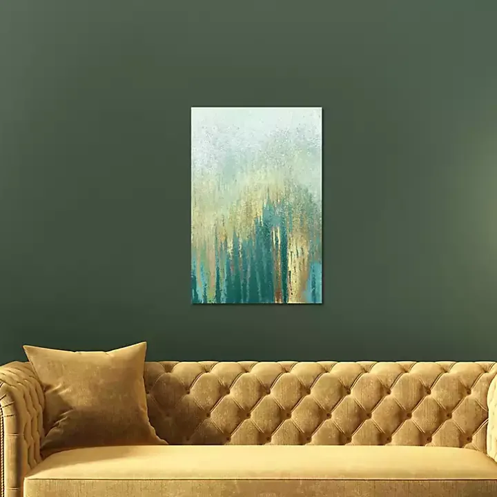 Upgrade your wall decor with our Teal Golden Woods Canvas Art Print. The canvas’ golden hues and modern abstract style will infuse modern flair into your room.