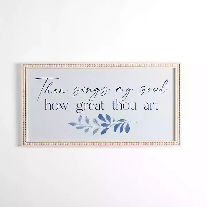 - Features the phrase “Then sings my soul how great thou art” in blue lettering