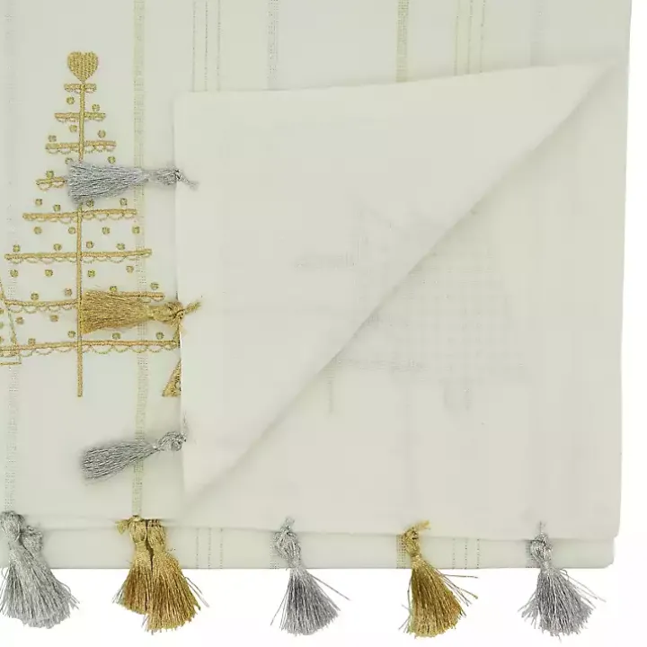 Give all your holiday meals a festive backdrop using this White and Gold Christmas Tree Table Runner! The gold and silver tasseled ends will add a whimsical touch to your tabletop!