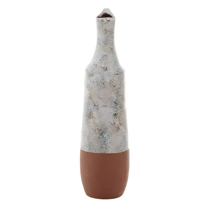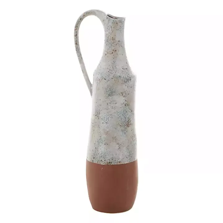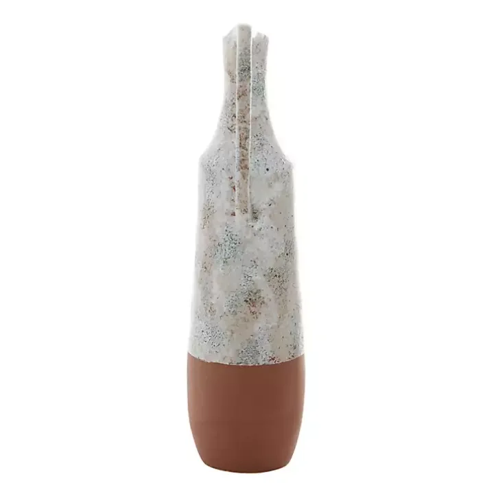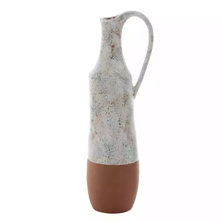 The White and Rust Brown Ceramic Vase complements any farmhouse home. The bubbled, marble-like glaze and exaggerated handle add a unique statement to any room.