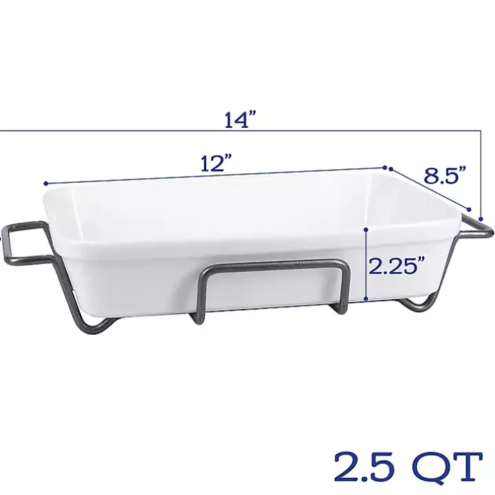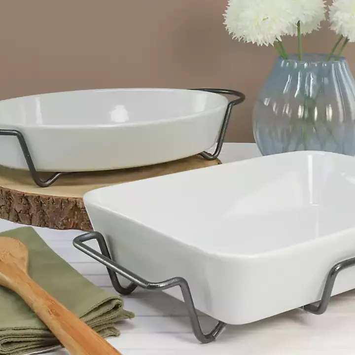Make every dinner a breeze with these White Ceramic Bakers with Racks! These classic bakers have their own metal racks with handles, letting you easily transfer your dish from the oven to the table!
