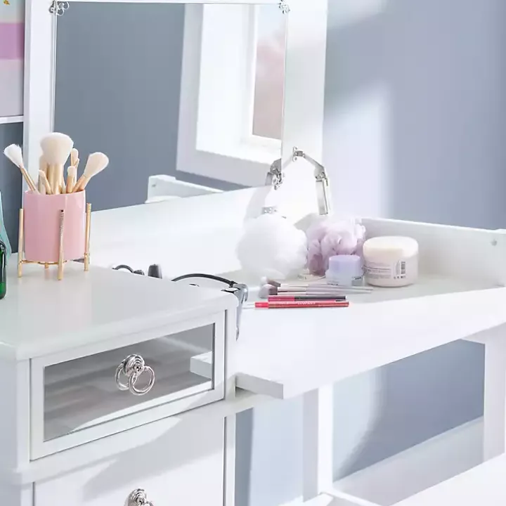 - Features a flip top mirror, one (1) drawer, and two (2) interior shelves