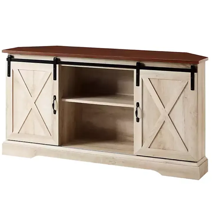 Our White Oak Sliding Barn Doors Corner TV Stand will showcase your love of farmhouse decor. Its corner cabinet design tucks neatly into any corner in your space. You will love how its two tone finish looks in any room!