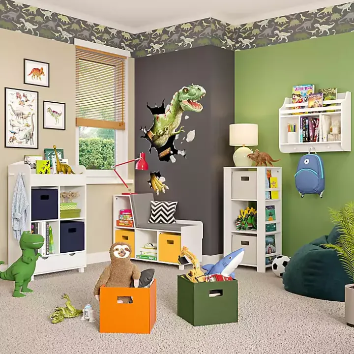 The White Storage Cabinet Bookshelf with 2 Navy Bins is perfect for keeping the playroom neat and tidy! The four cubbies, two drawers, and two hooks offer plenty of space to organize toys and more.