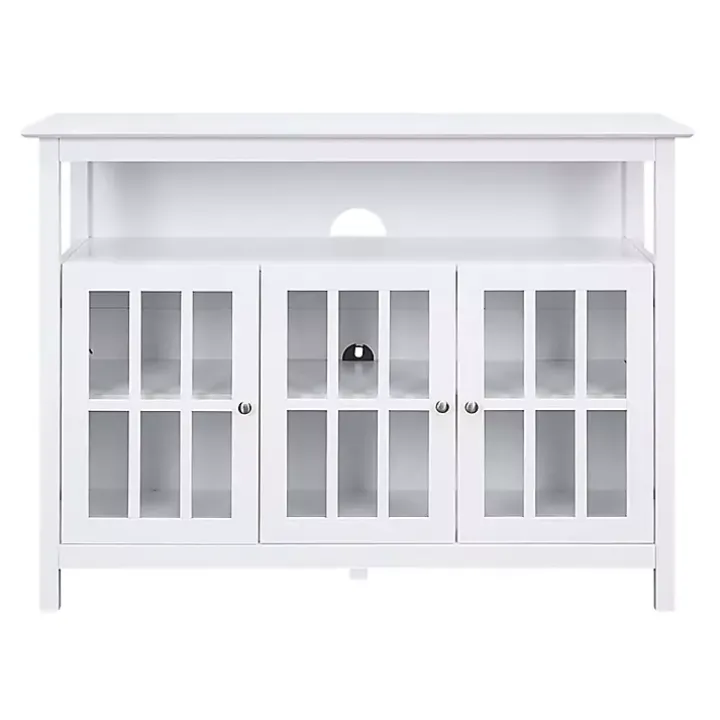 Upgrade your living space with this White Tiered Deluxe Cali Media Cabinet! With plenty of storage space and a windowpane design on the cabinet doors, this cabinet is perfect for a traditional style home!