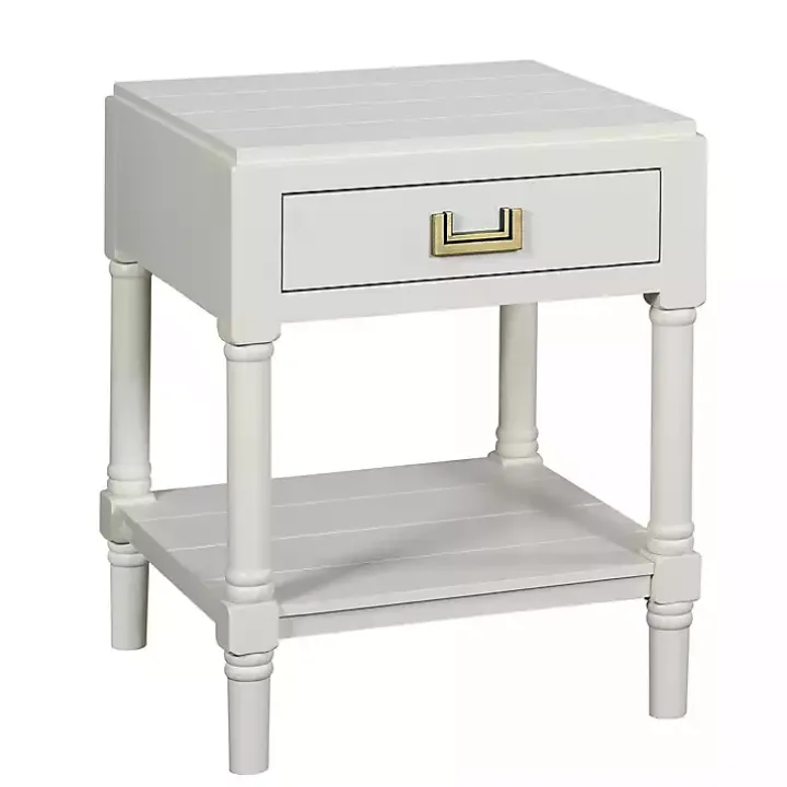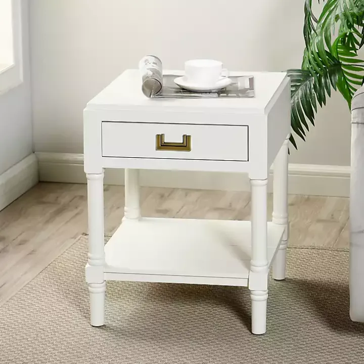 Effortlessly elevate your space with this White Wood Layla Accent Table! Featuring one drawer with an antique brass pull and one lower shelf for additional storage, you’ll love the stylish and functional design of this accent table!