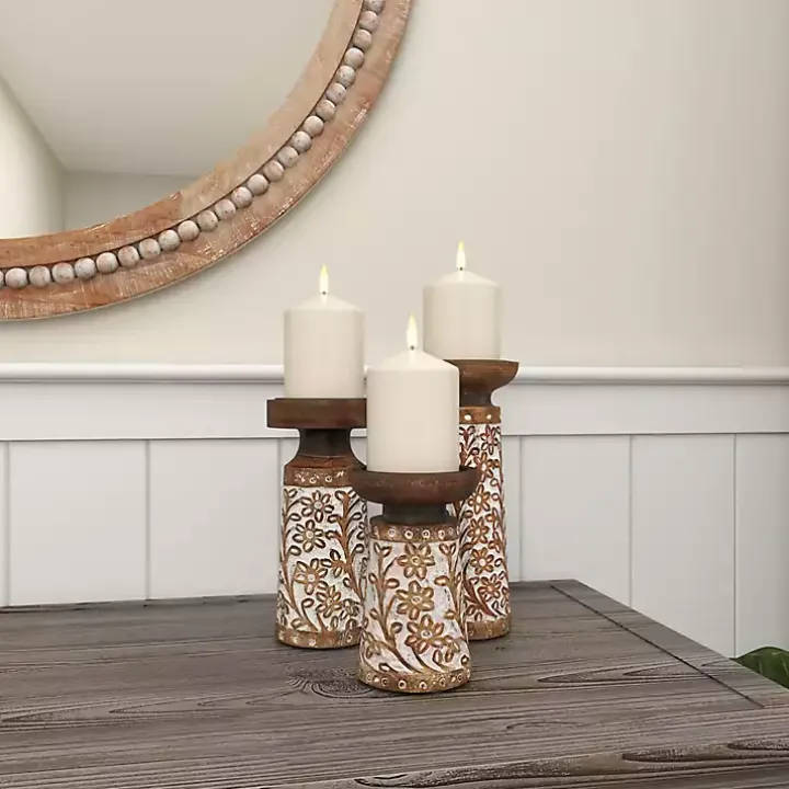 Light up your boho chic decor with the help of these Whitewash Floral Mango Candlesticks! You’ll love the carved embellishments and the natural distressed wood finish.